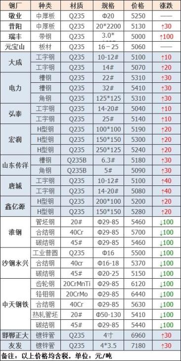 3月1日廣東河源德潤(rùn)鋼鐵廢精密管價(jià)格格漲50元:鋼筋切粒3530;邊角料,新鋼板料3500;純鋼筋頭,直鋼筋3480;模具鋼、料頭圓鋼、軌道鋼、火車輪3480;硅鋼片停收;冷軋、熱軋、碎料沖子3430;優(yōu)重3480;鍛打料、馬蹄鐵3480;重廢3450;機(jī)械生鐵、高碳鋼、鑄鋼件、生熟混裝3450;厚剪3400,不含稅。
